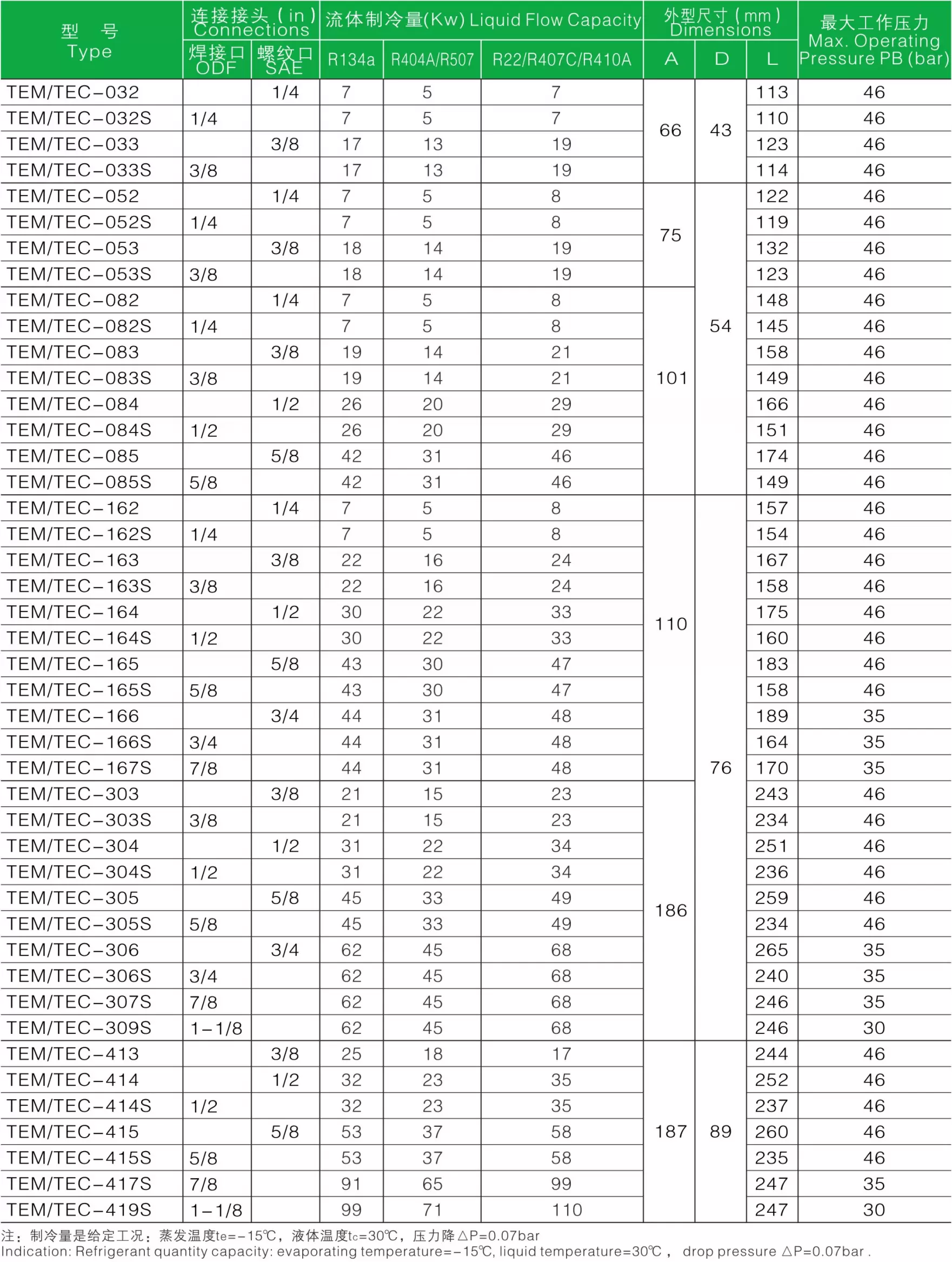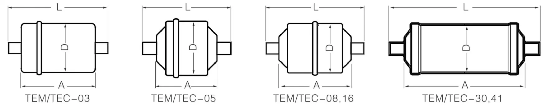 TEM/TEC liquid line filter driers protect refrigeration and air conditioning systems from moisture, acids and solid particles. The TEM/TEC filter dri-ers are designed with a solid core. TEM is with 100% molecular sieve, and TEC is with 80% molecular sieve and 20% activated alumina.