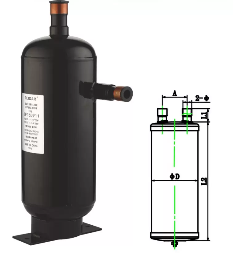 A suction line accumulators is designed with bend pipe to prevent internal splas-hing and in the col-lection of refrigerant,and the bend pipe should be installed nearthe compressor as possible.